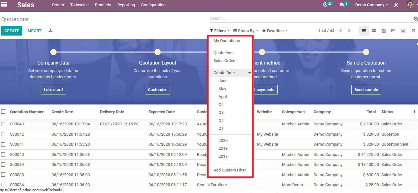 The option to add custom filters can be chosen in need here the user can also add a condition. It helps the user in need of filtering the data on the basis of two or more parameters. For example, a customer containing an expiration date of 18/6/2020 is filtered. Add a conditioned feature that comes in handy while going through the quotations and sales orders.