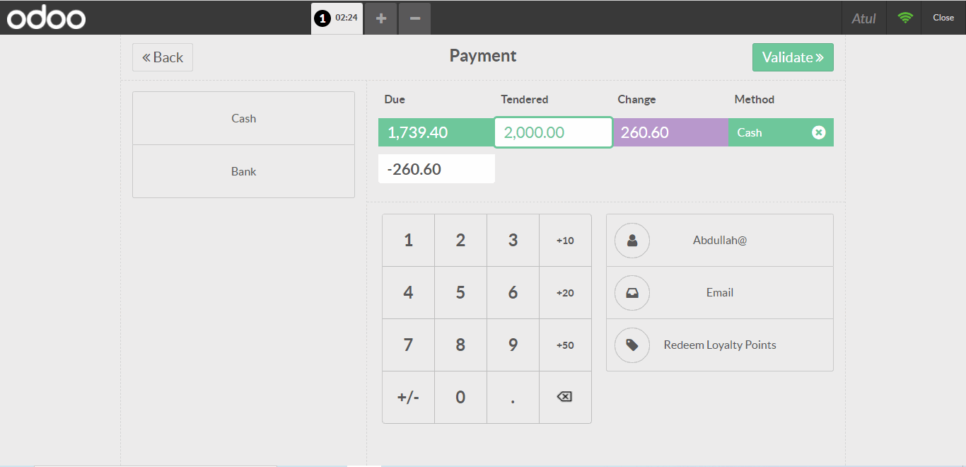 Customer can pay their bill by multiple method like cash, bank ,paypal, neteler , payza, bkash etc. After payment we have to click on validate and its done, we can go for the next customer.